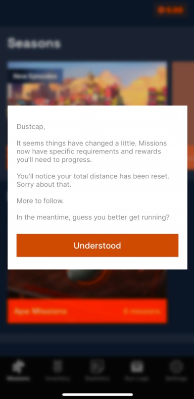 Note: To ensure that all players get a fresh start to the Alpha Rewards and Crafting system, all running stats have been reset. Players will see an in-app prompt as below. This means you will have to go through all the missions again so that you can: