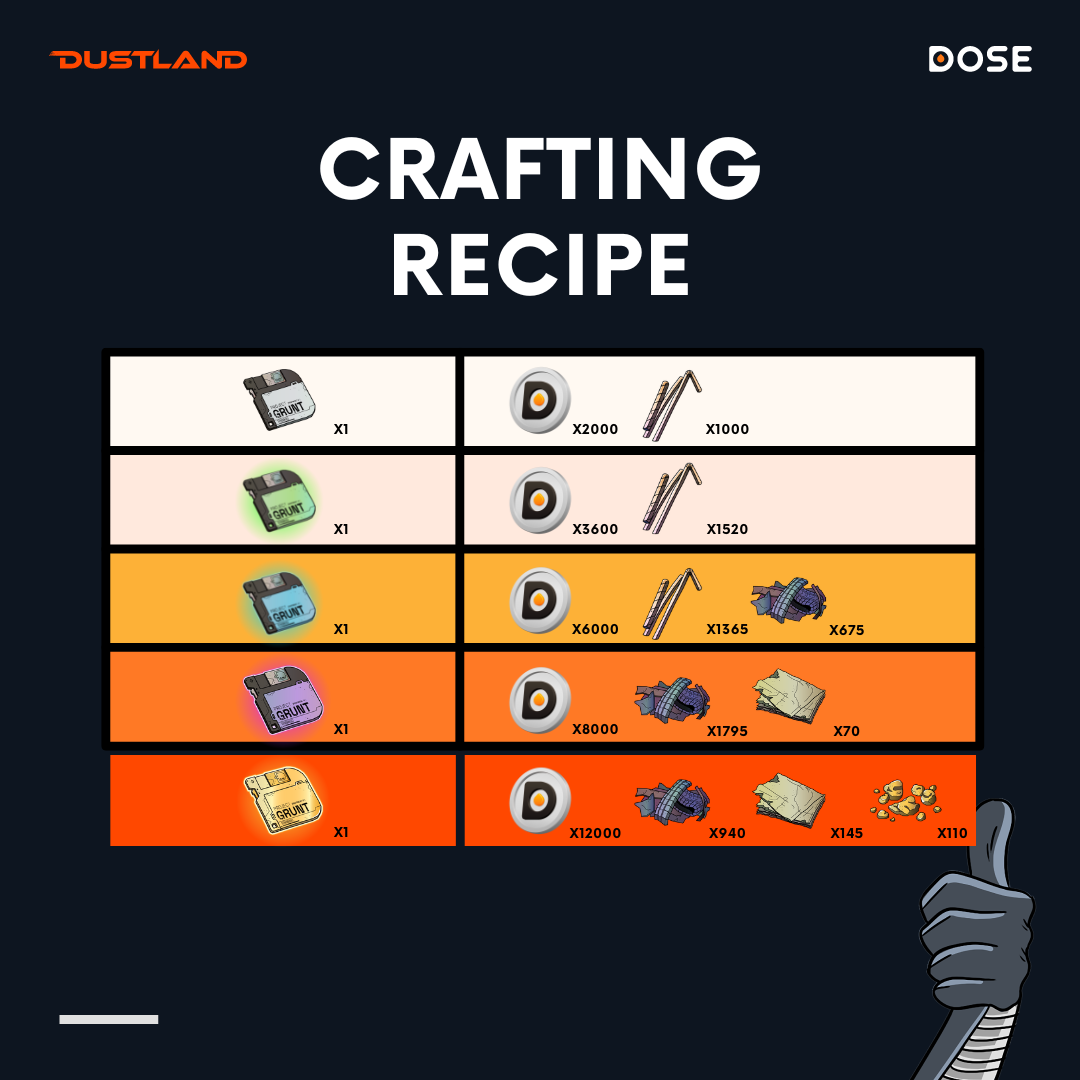 <figure><img src="https://4171392296-files.gitbook.io/~/files/v0/b/gitbook-x-prod.appspot.com/o/spaces%2FgkGPxkrcYEVLFuTqYYo4%2Fuploads%2FnUzU2Gpr4BI5hNmidArc%2FDustland%20Crafting%20Recipe.png?alt=media&#x26;token=1b70e02d-1acf-4593-a2e4-2535abbd615f" alt=""><figcaption></figcaption></figure>